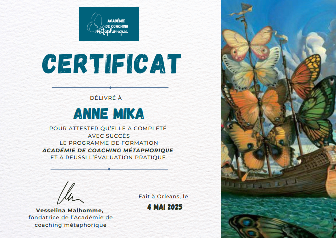 Cette technique de Coaching Métaphorique, je l’ai découverte et vécu auprès de Vesselina Malhomme, créatrice de moietheureuse et coach professionnelle pour Hypersensibles, Zèbres, HPI. Après avoir développé, amélioré sa pratique, elle a décidé, en 2025, d’ouvrir les portes de l’Académie de Coaching Métaphorique. Et j’ai sauté le pas avec joie, tant cette pratique, d’apparence simple et ludique, est transformatrice.
